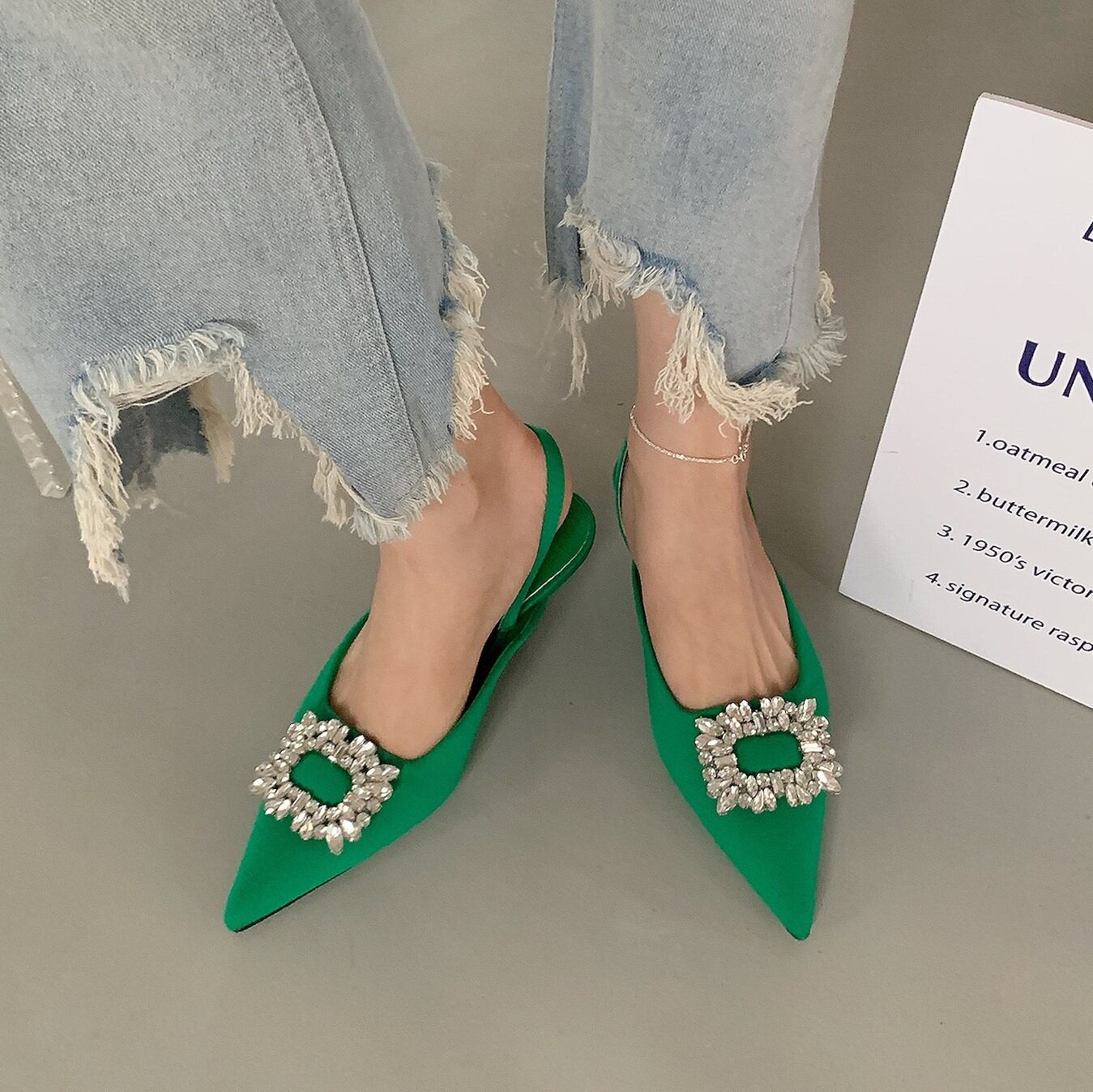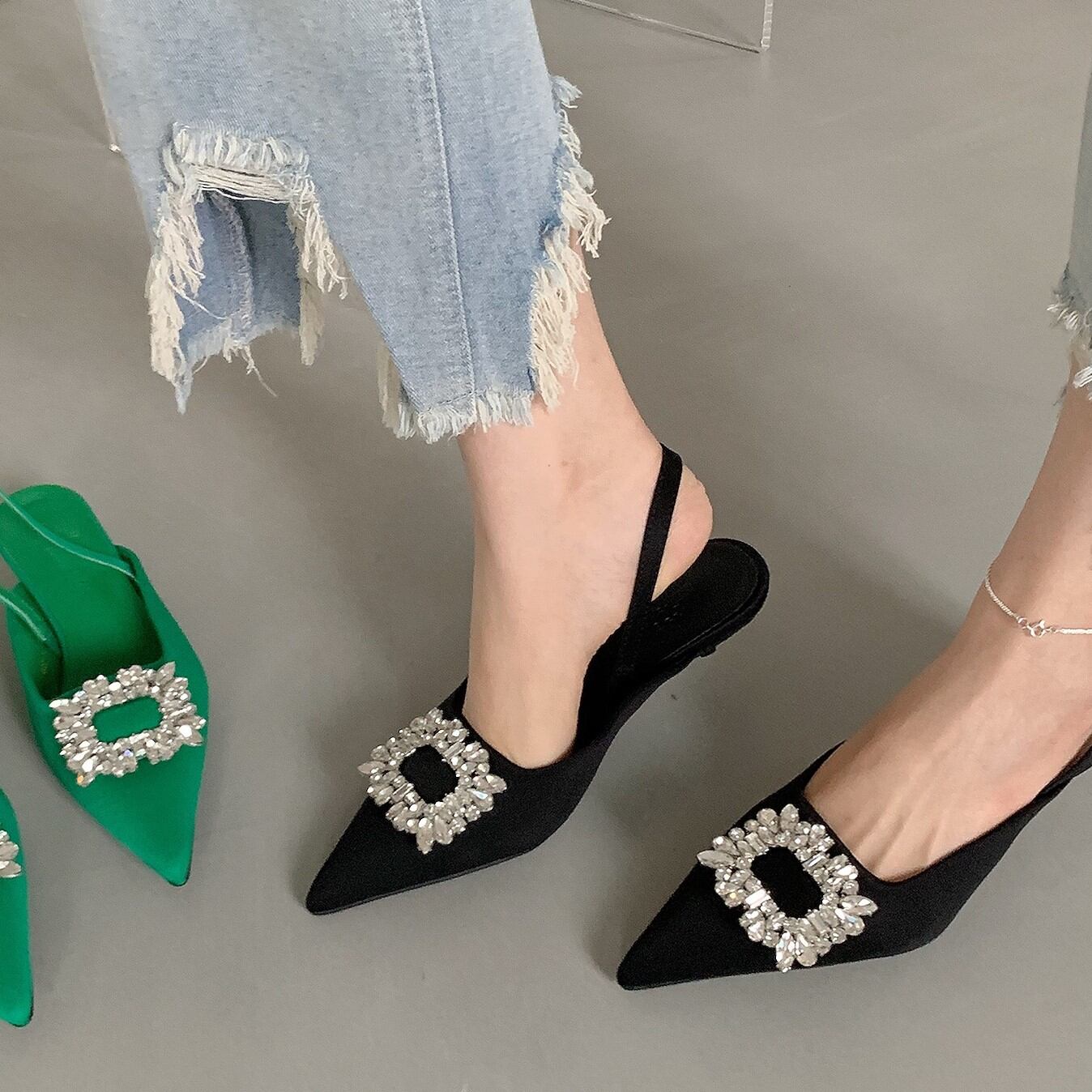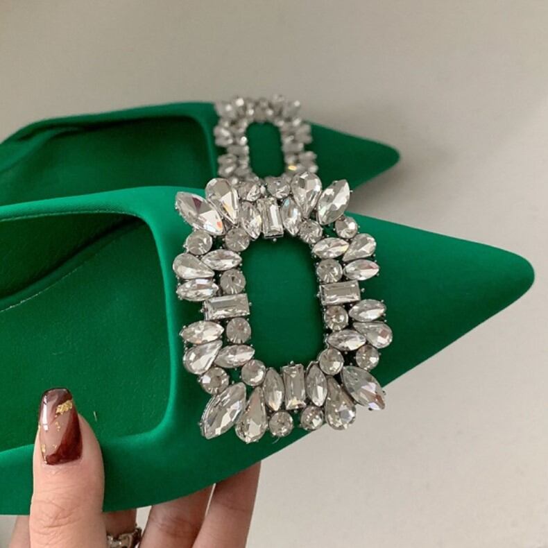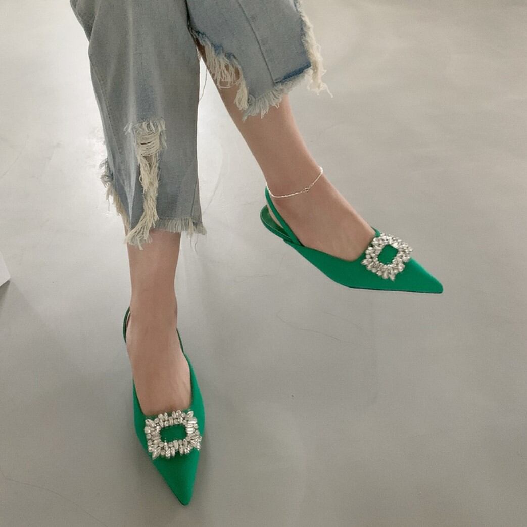 シャープなつま先のビジューが足元を華やかに演出。