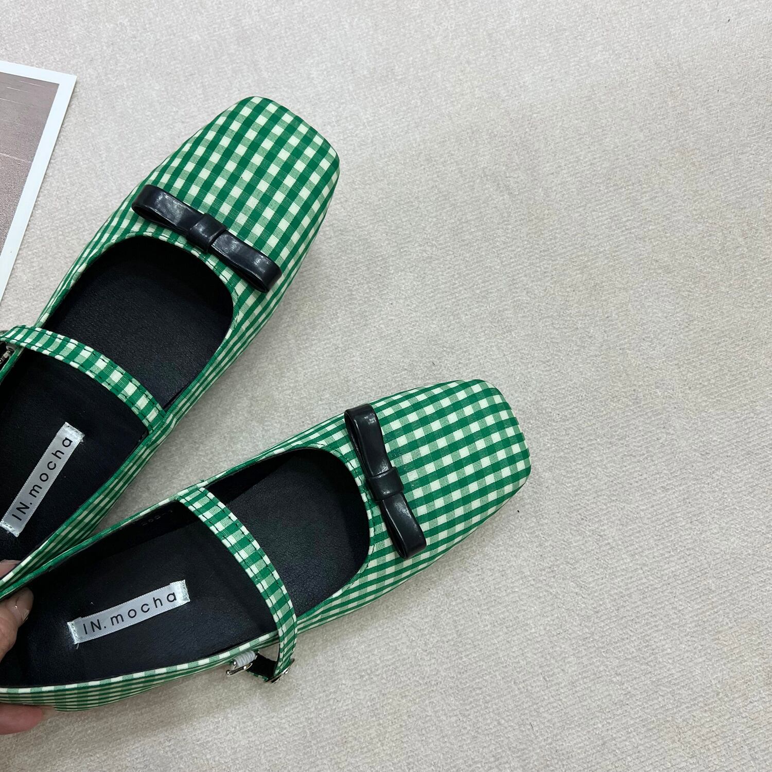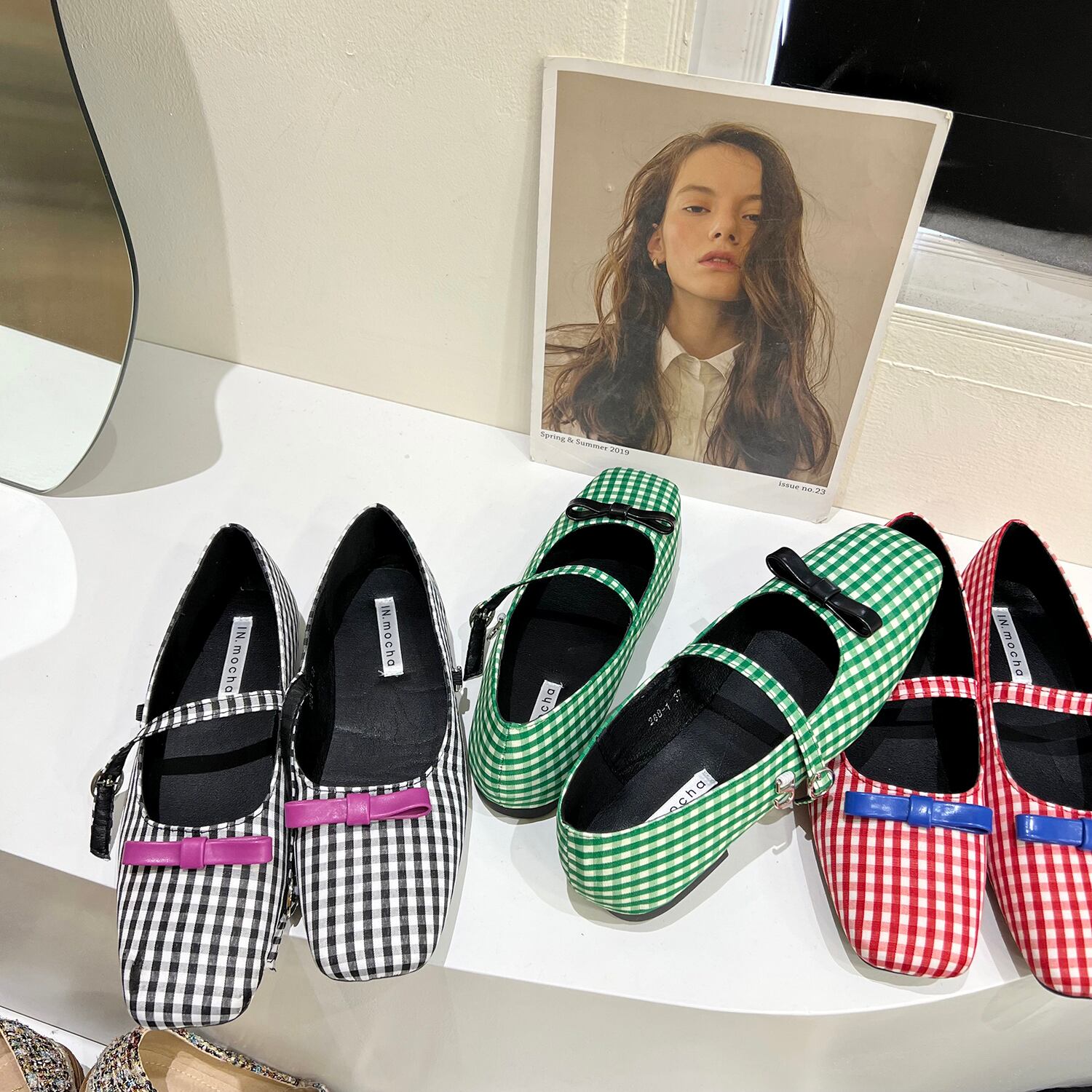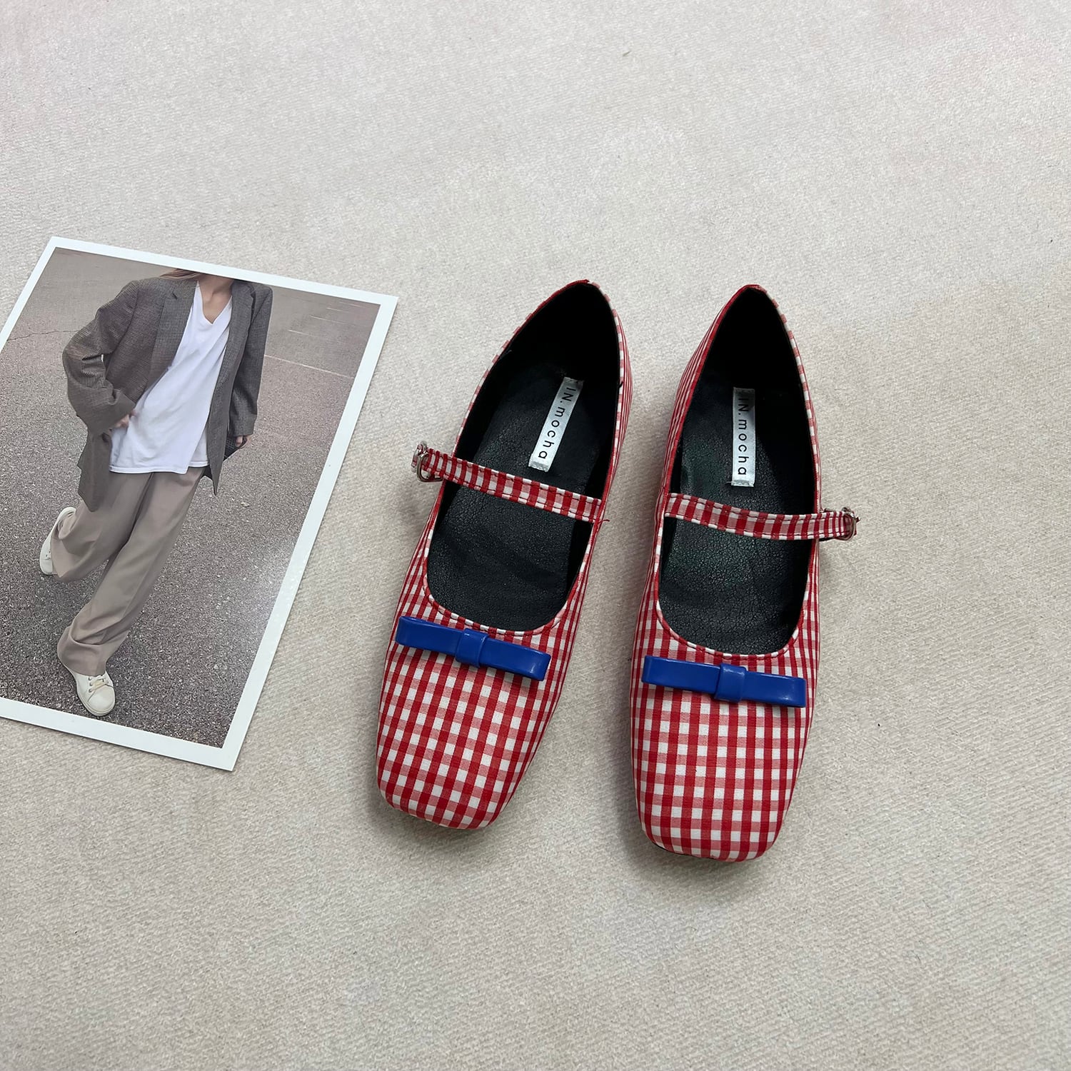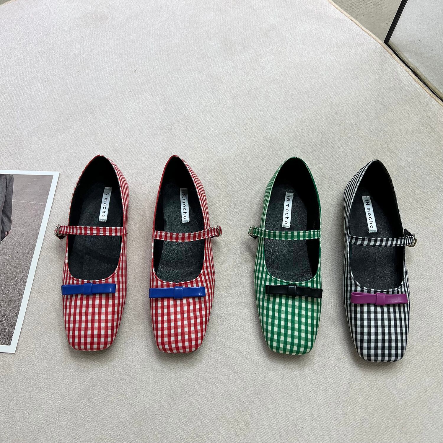 ギンガムチェック柄とリボンのコントラストで、カラフルなシューズ。