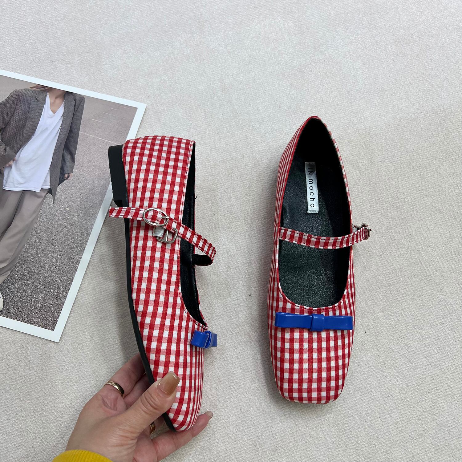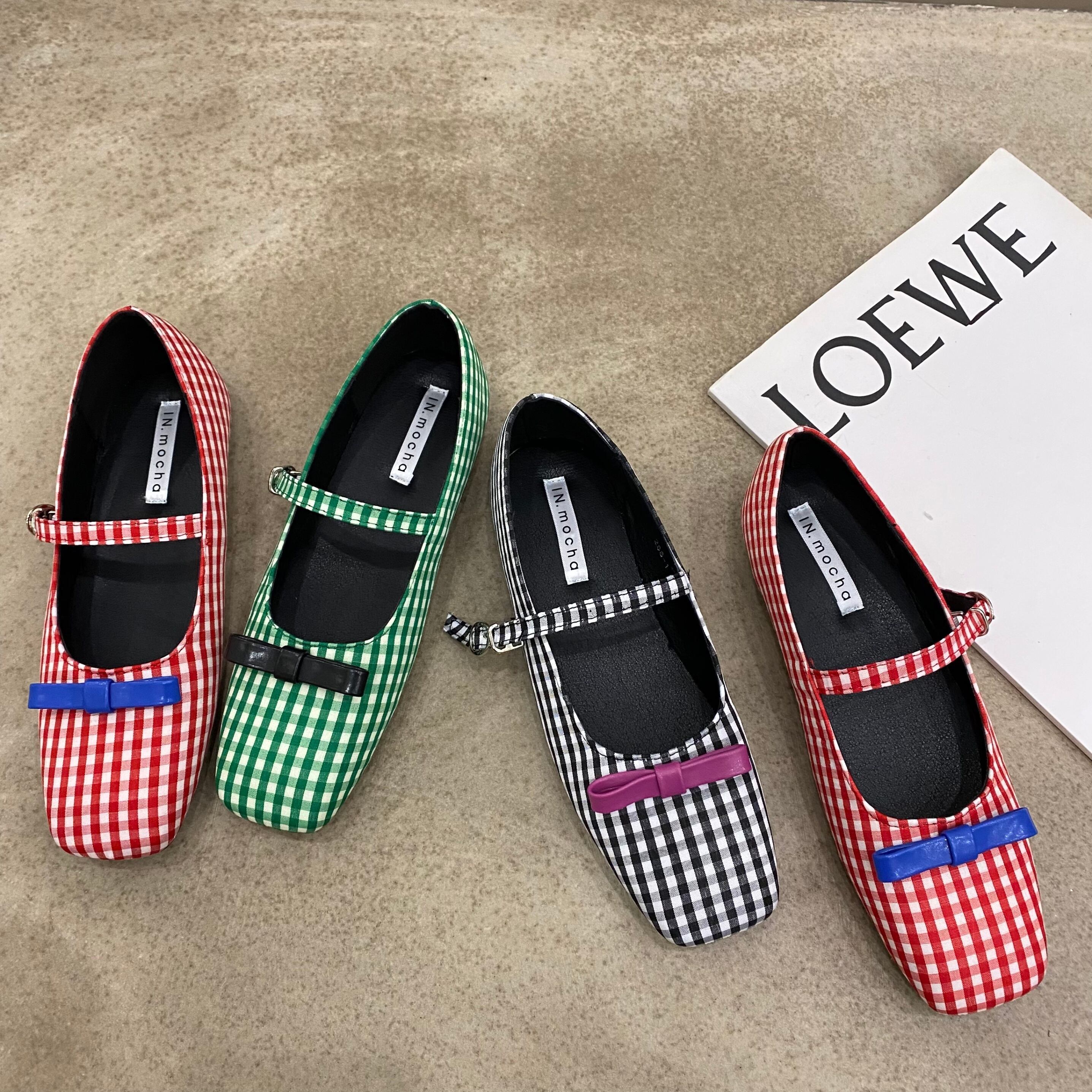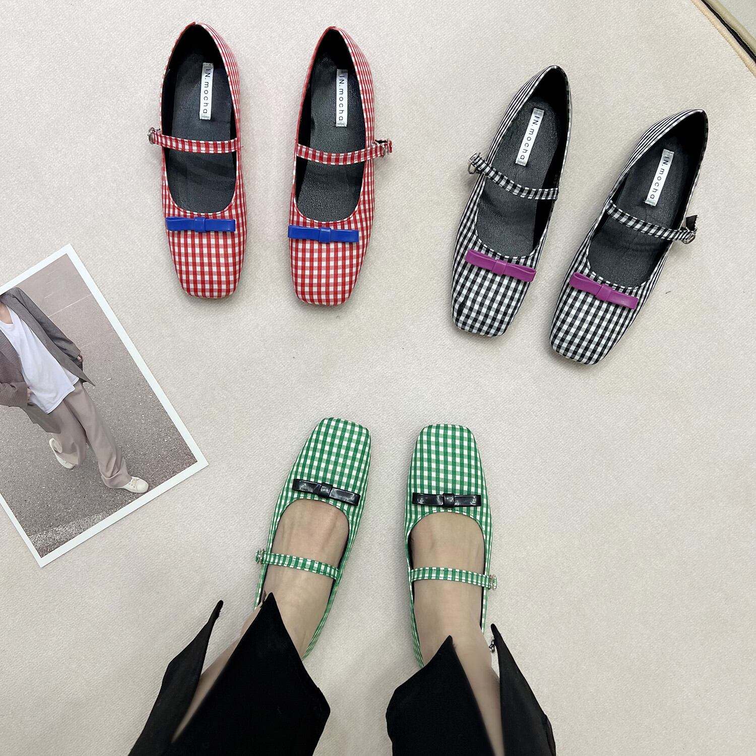 ギンガムチェック柄とリボンのコントラストで、カラフルなシューズ。