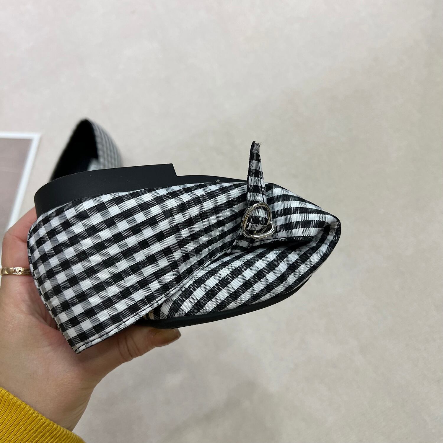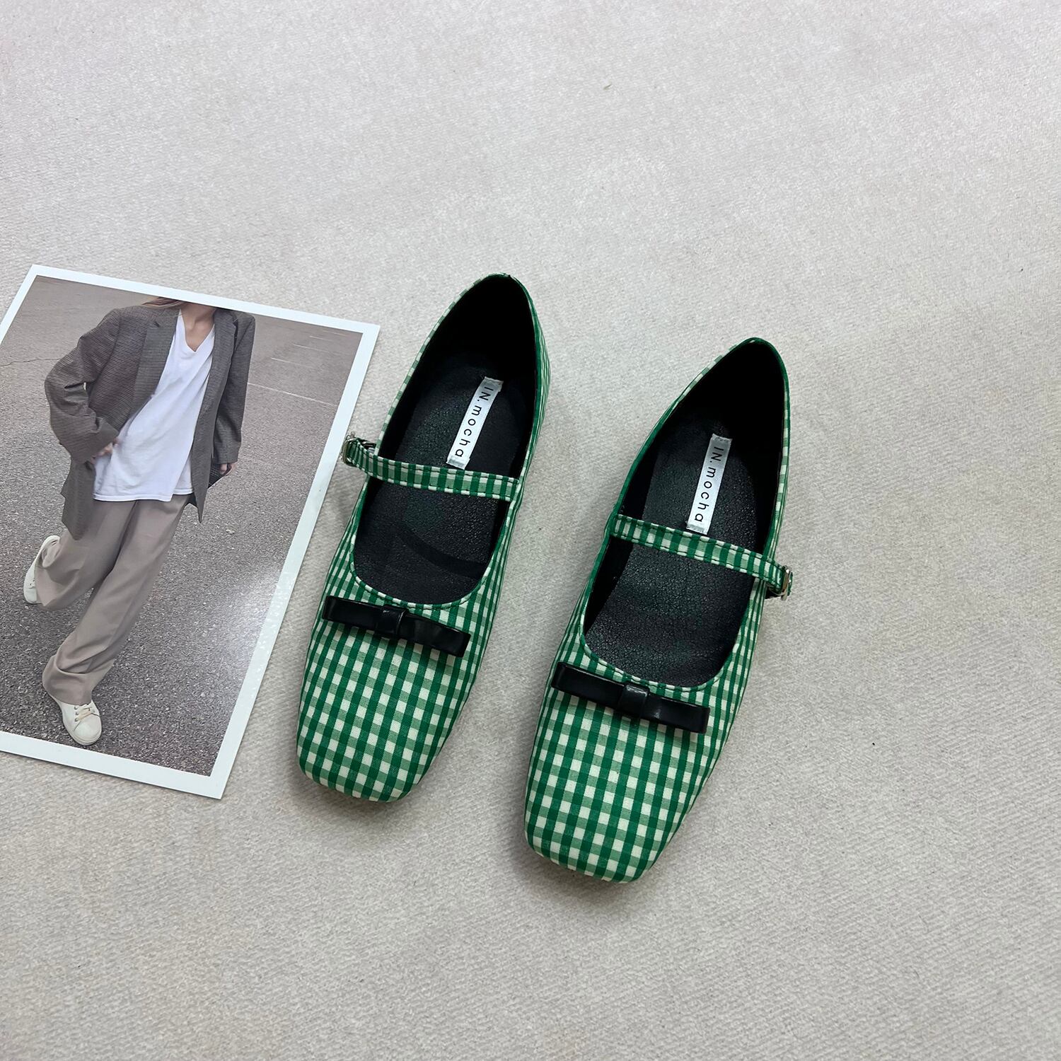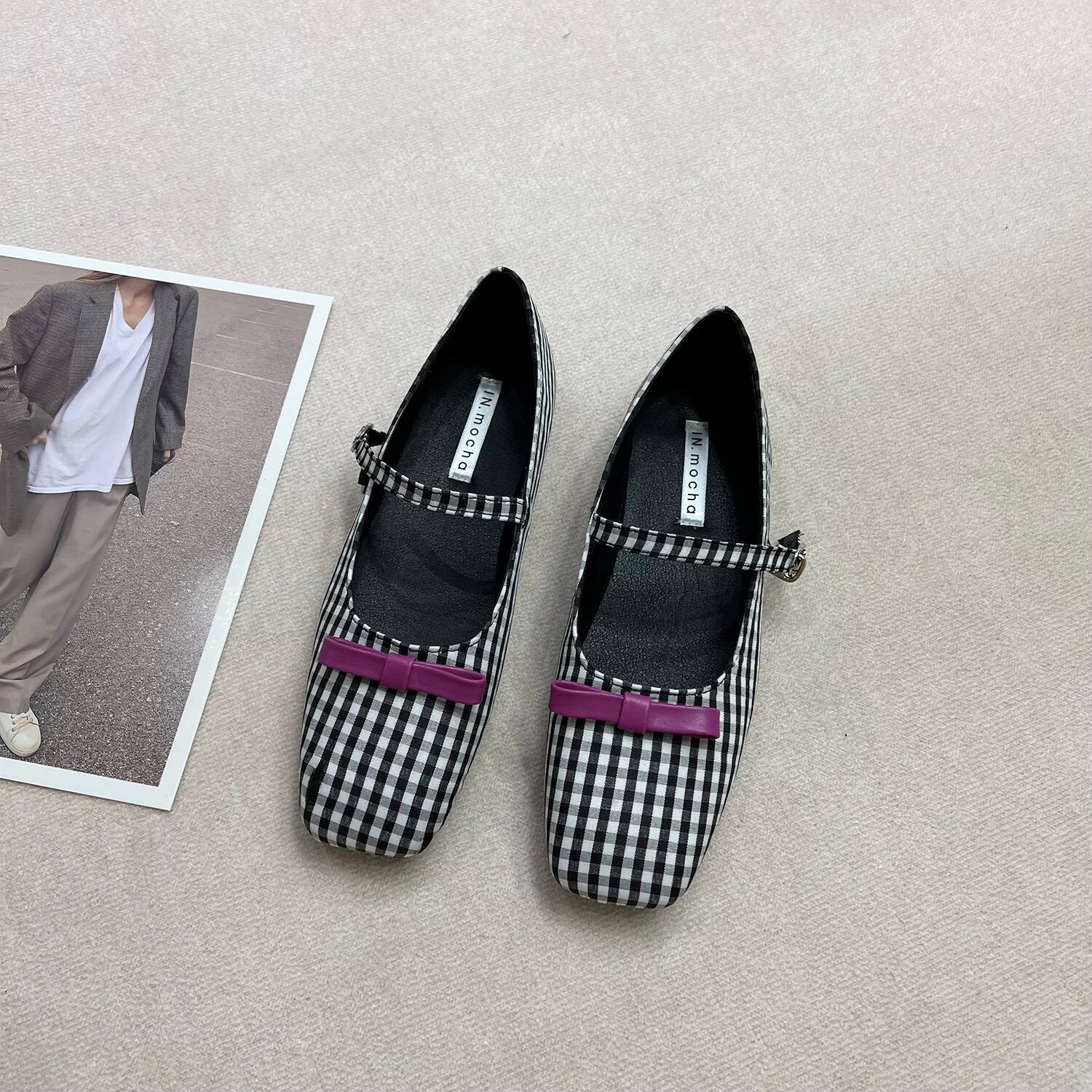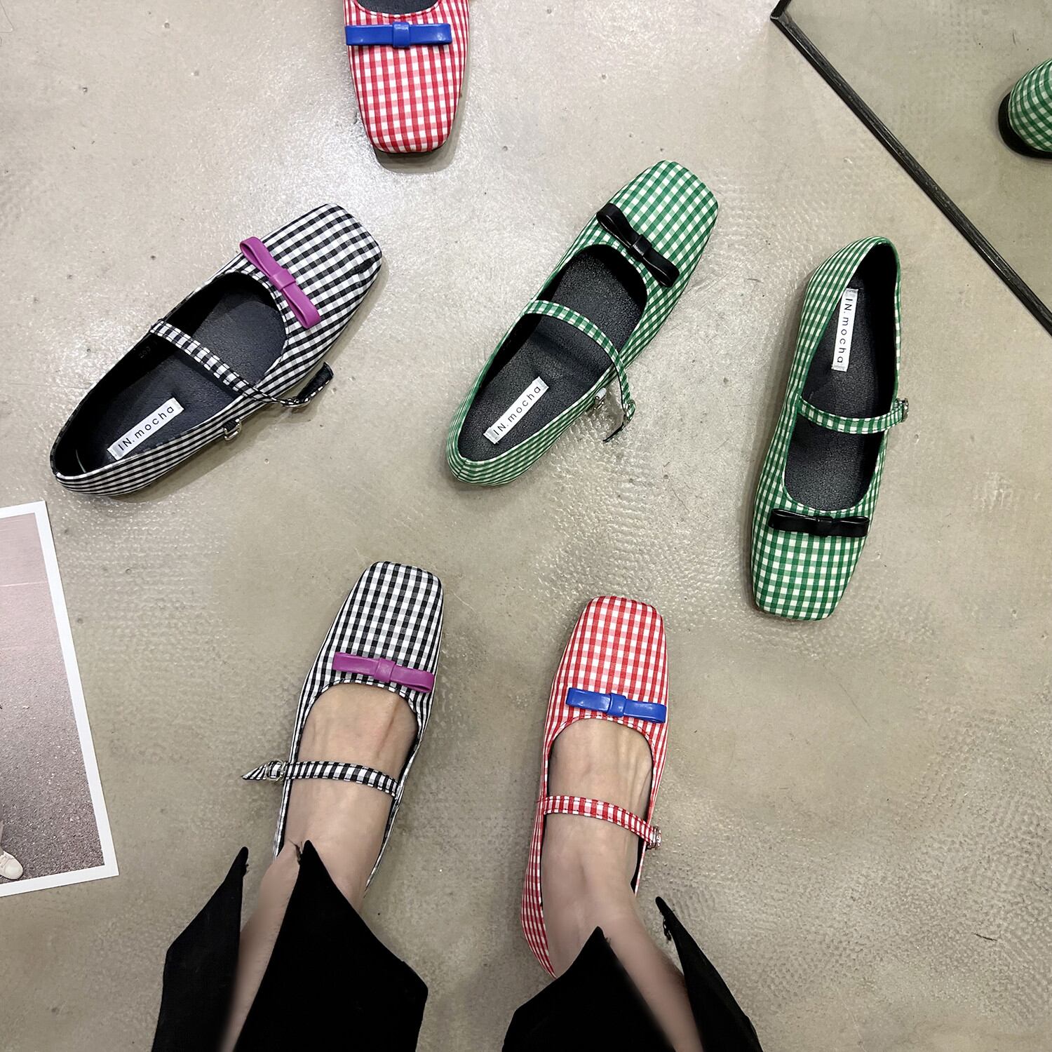 ギンガムチェック柄とリボンのコントラストで、カラフルなシューズ。
