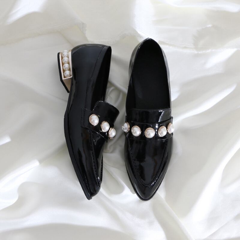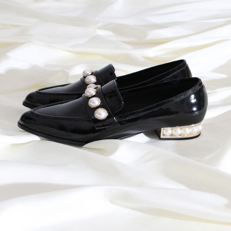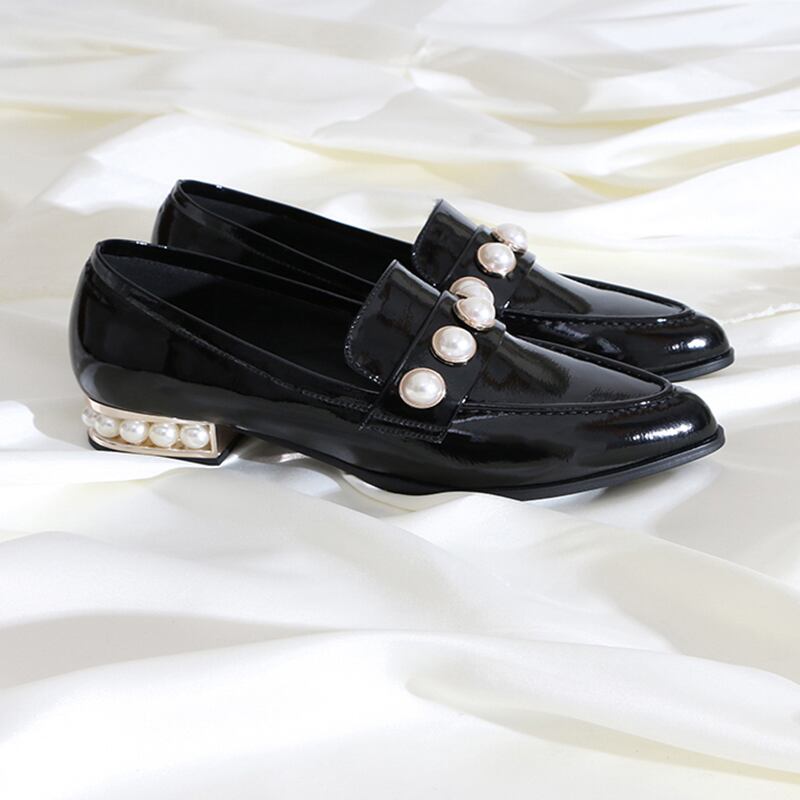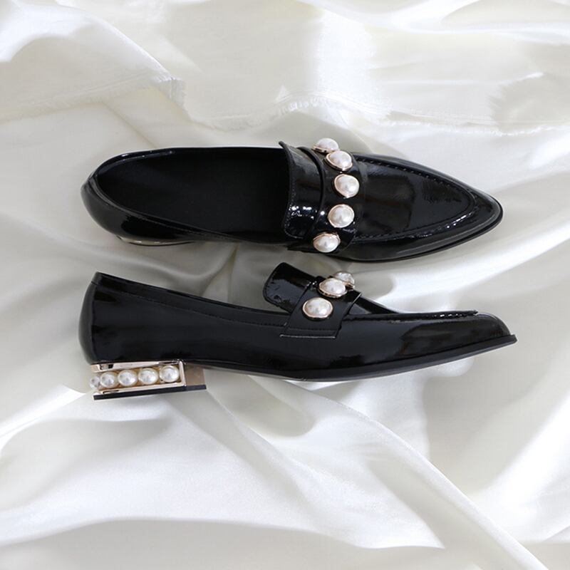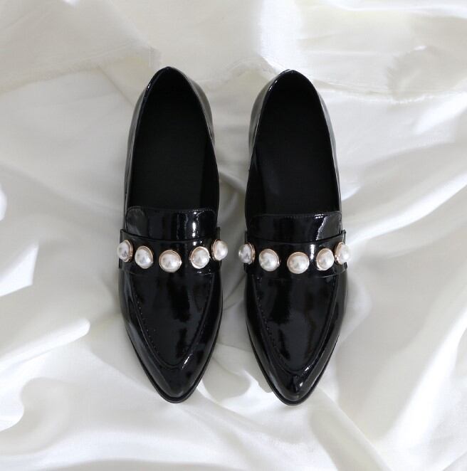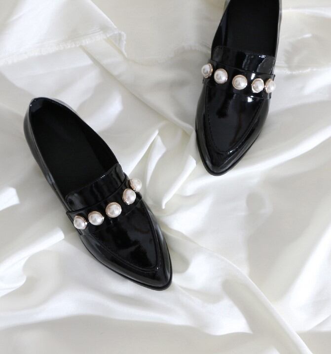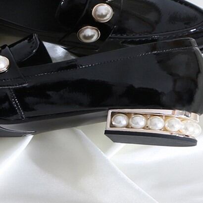 ツヤ感たっぷりのローファーがクラシカルなムードに。