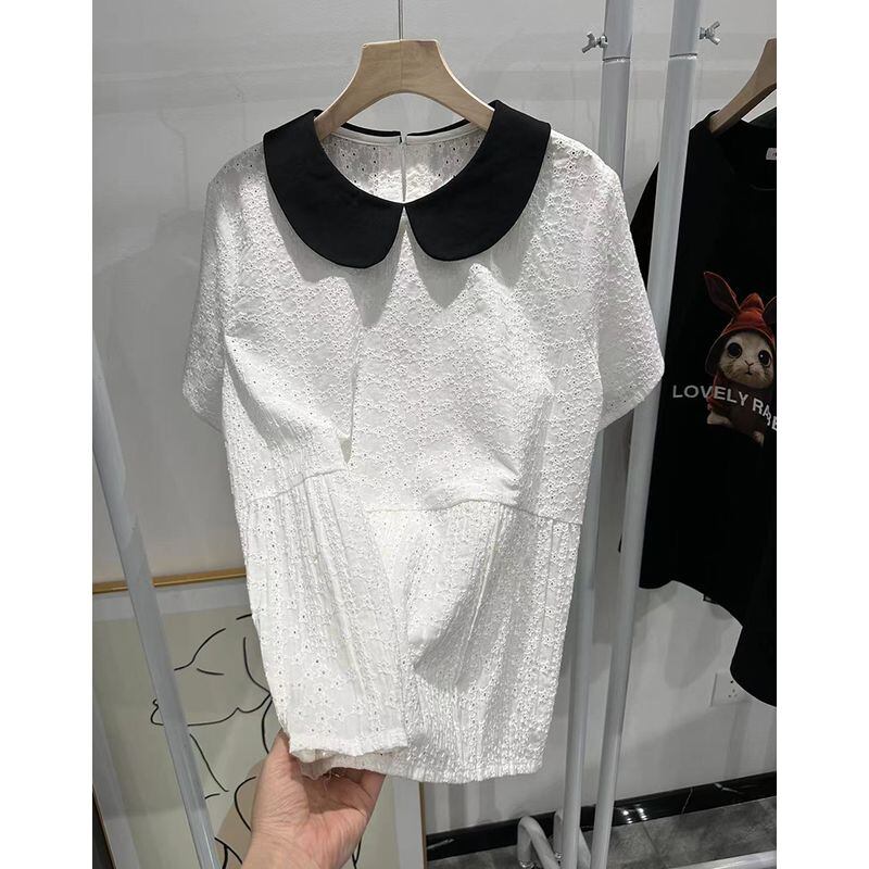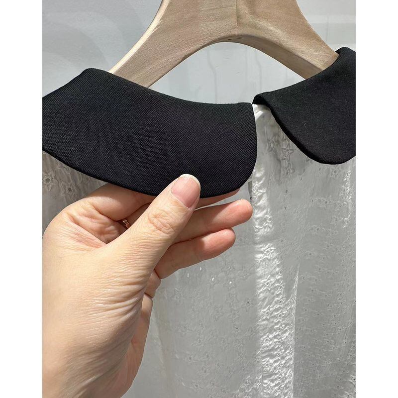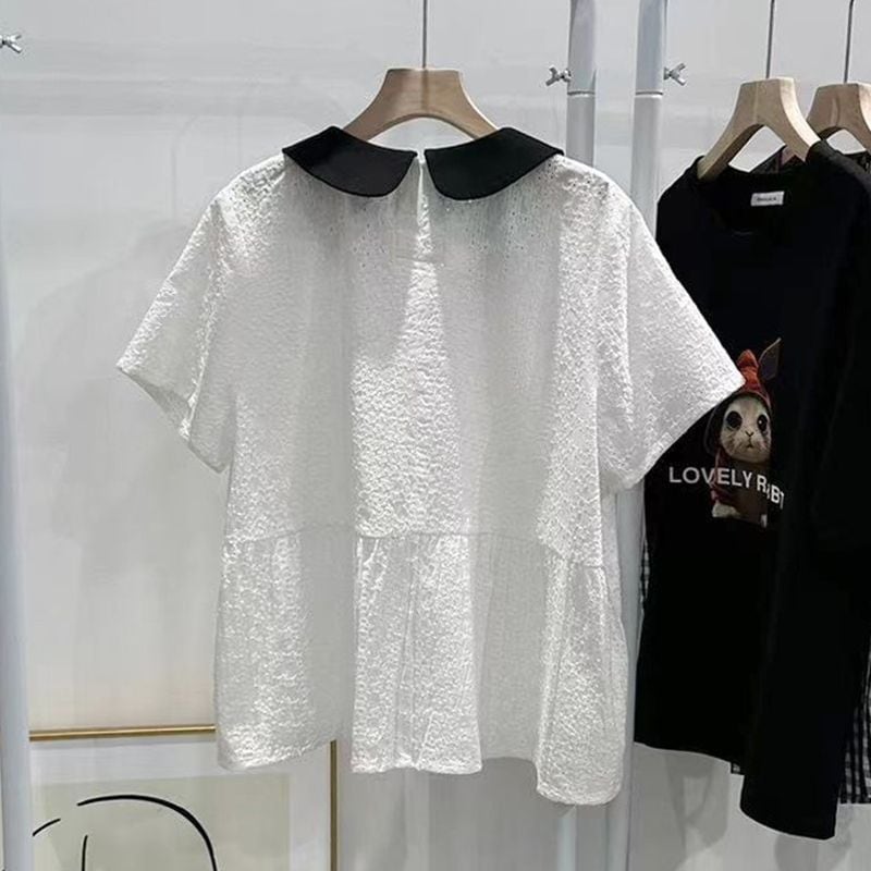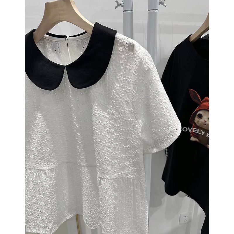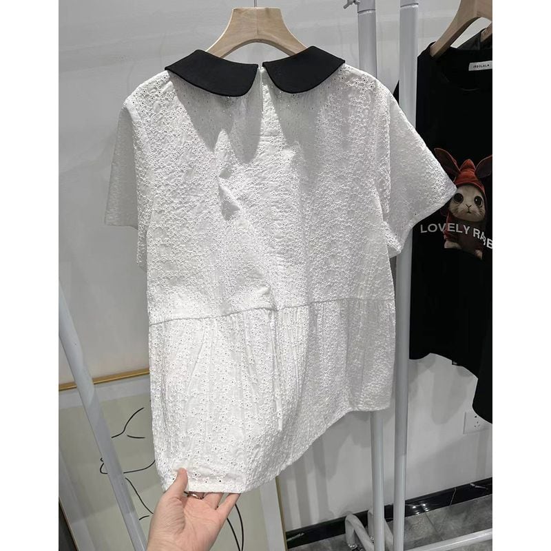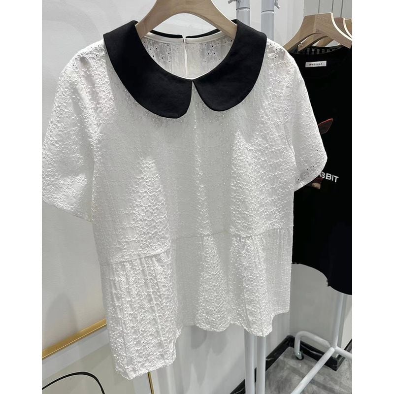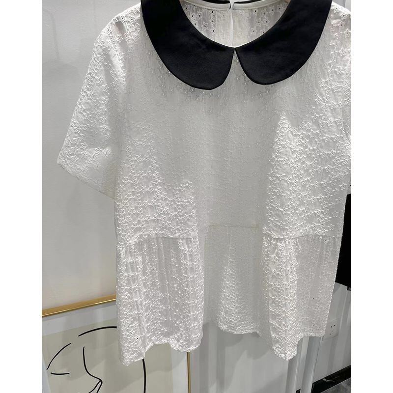 個性的な丸襟と刺繍が華やかなバイカラーシャツブラウス。