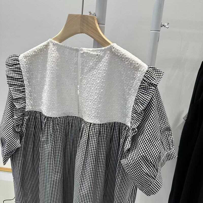 チェック柄の半袖ブラウスにフリルがアクセントになった一枚。